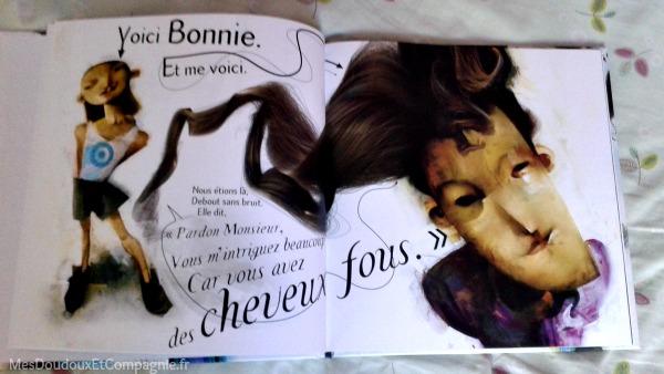 Mais dans notre histoire, c’est juste un monsieur aux cheveux fous. Intriguée, Bonnie lui demande pourquoi ses cheveux sont si fous. Mystérieux, le monsieur lui raconte mille et une histoires plus folles les unes que les autres sur ses cheveux. Un univers de folie s’y cacherait.