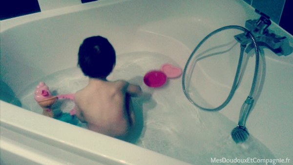 En Novembre, mon bébé qui depuis des mois avait fait du bain un calvaire pour moi, une torture pour lui, est soudainement devenu accro à ce moment à patauger dans l’eau. Il s’assoit même dedans, lui qui jusque là restait toujours debout. Attention, désormais, la salle de bain se transforme vite en piscine, surtout quand il décide de jouer avec la douchette. Il jette toutes les figurines dinosaures en plastique de TiBiscuit dans l’eau et pourrait jouer des heures.