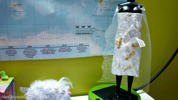 Du haut de ses presque 7 ans, Chupa n’a pas obtenu le résultat de ses rêves, mais elle a su l’utiliser pour ses poupées. Au moins, nous n’aurons pas à acheter le modèle de poupée Raiponce en robe de mariée. Raiponce pourra malgré tout se marier en robe blanche, sauf que la robe de mariée sera plutôt version Tati … mais de créateurs tout de même, nanmého ! Oui, ma fille est une créatrice.